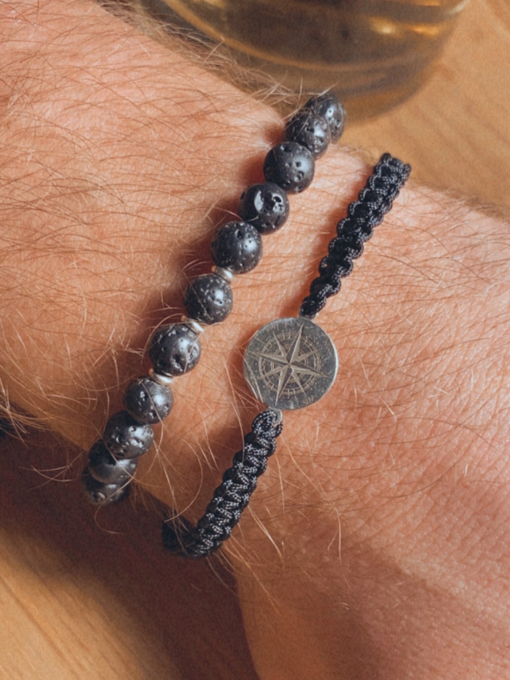 Męska bransoletka z kompasem stworzy świetny zestaw w klasyczną bransoletką z czarnego onyksu.
