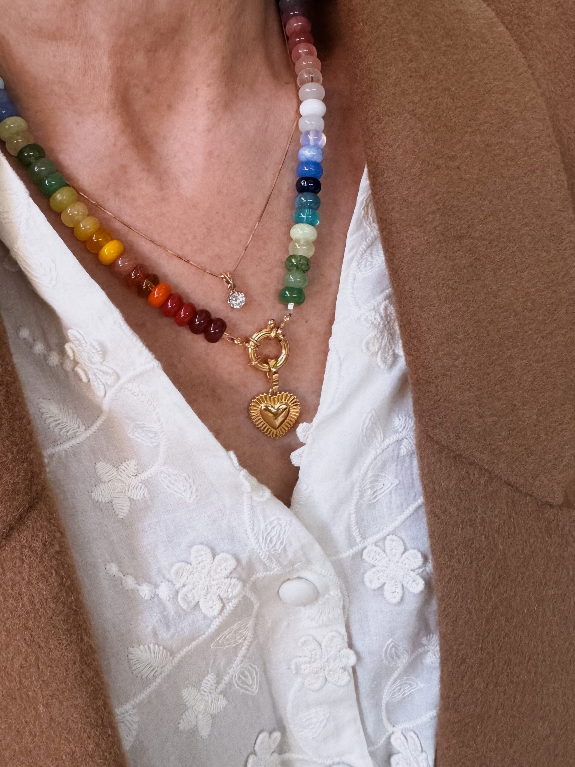 Maksymalna dawka kolorów ukryta w naturalnych kamieniach z ozdobnym elementem, dewizką, która jest jednocześnie zapięciem naszyjnika.