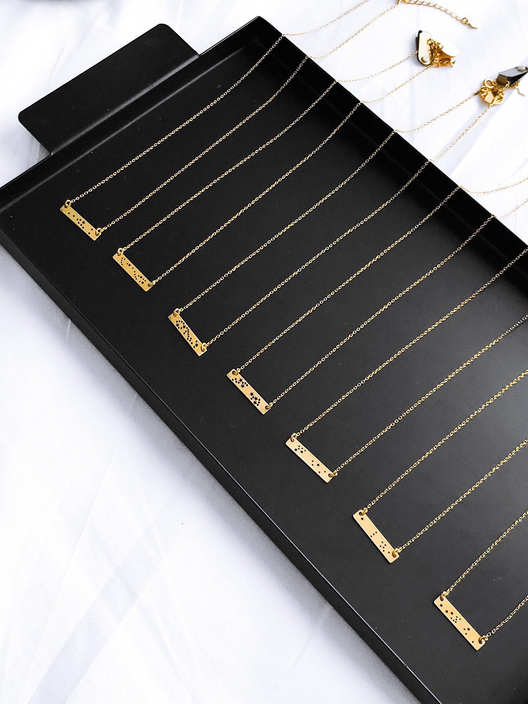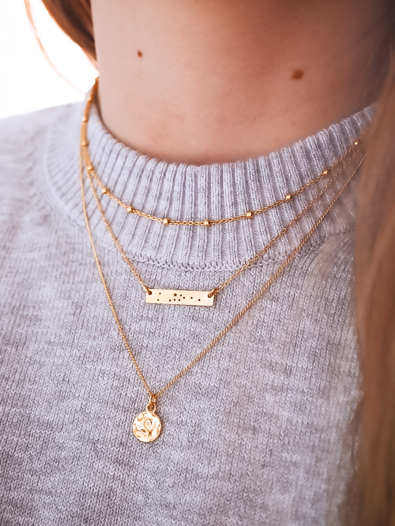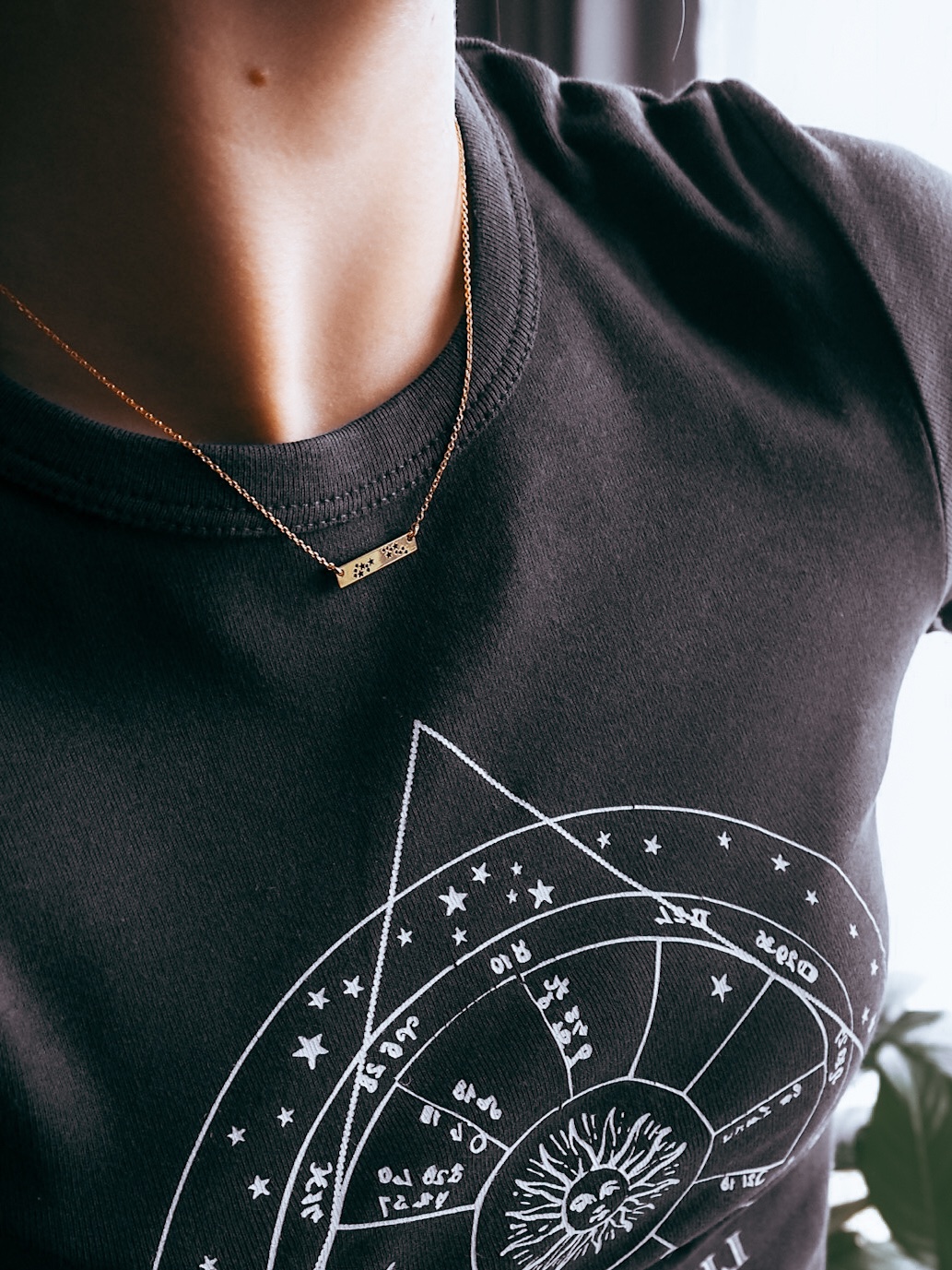 Naszyjnik z konstelacją znaku zodiaku to głównie przeurocza blaszka z wybitymi gwiazdkami odpowiadającymi gwiazdozbiorom znaków zodiaku na niebie. Pięknie mieni się i odbija światło na szyi. A do niej wykorzystałam delikatny i klasyczny łańcuszek. Blaszka na stałe jest przyczepiona na środku łańcuszka, dzięki temu nie będzie on obracał się wokół własnej osi.
