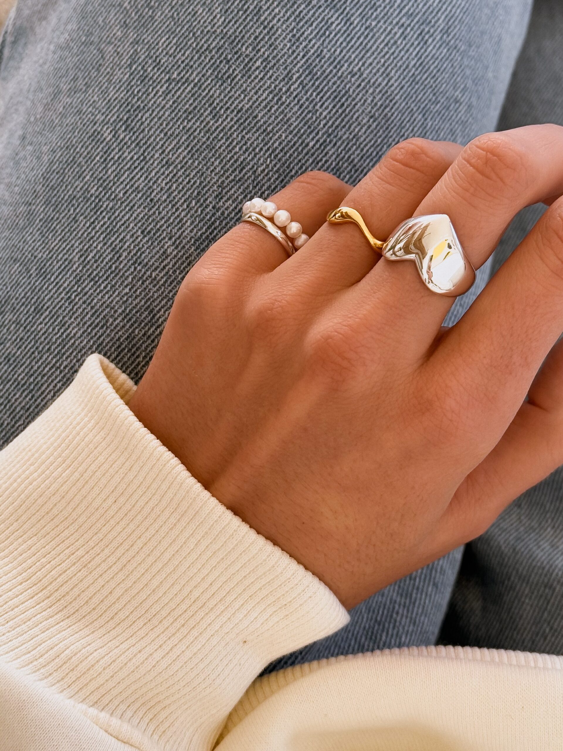 Pierścionek Fala to z jednej strony subtelny dodatek, a z drugiej strony przyciągający wzrok kształt fali, widoczny z daleka. Wygląda pięknie noszony pojedynczo i dodaje charakteru noszony w duetach z większymi modelami, jak na zdjęciu z modelem Morze z niebieskim oczkiem.